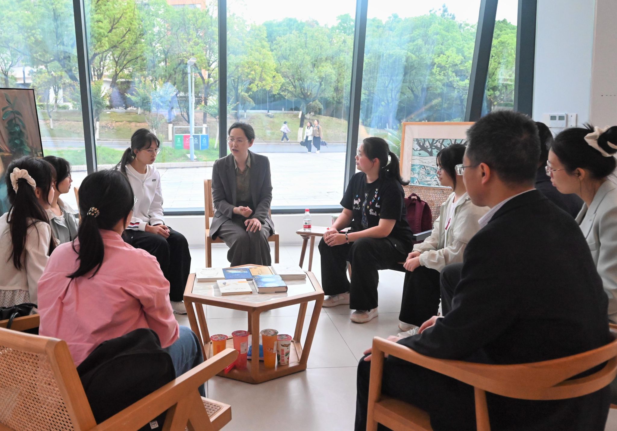 活动伊始,甘雅芬认真聆听每一位同学的分享,并结合自身阅读经历与人生体悟,逐一点评指导。她动情讲述了自己“与书为伴”的故事,指出阅读的意义,在于锻造独立思考的能力,塑造个体精神骨骼,从而走向更广阔的世界,遇见更柔韧的自己。她希望同学们“爱读书、读好书、善读书”,摒弃功利心态,静心阅读经典,把寝室住成一座小小的精神岛屿,彼此照见、各自丰盈,在沉浸式阅读中涵养正气、升华境界。